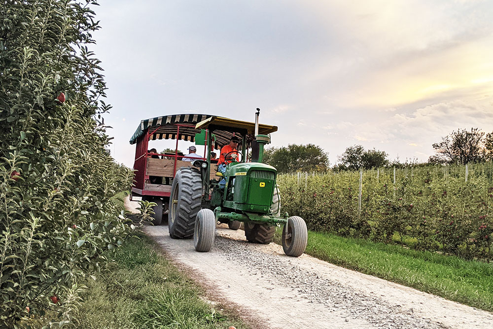 - Hayrack Ride to the Apple Orchard: For a ride to the orchard, you purchase a you-pick bag before boarding the hayrack. Then you’re dropped off at a spot where apples are ripe and ready for picking. Check which varieties are in season on our you-pick apple page. Running 9am to 6:30pm daily.
