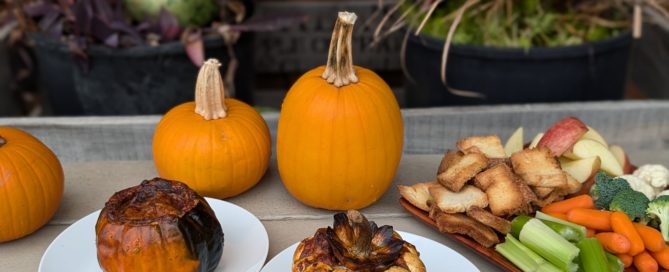 This is one of our favorite recipes from the Vala's Pumpkin Patch Cookbook! Cheese, cream and toast get baked inside a pumpkin or squash until they're hot and melty, the perfect appetizer or vegetarian main course. This would make the perfect Thanksgiving appetizer! See how Kelsey and Chef Jeff play around with different options in the Vala's Test Kitchen. Pumpkin Fondue Try this with different sized pumpkins or squash. It's a fun, delicious appetizer perfect for any fall get-together or the Thanksgiving table! 1 baguette (about 7 ounces, cut into 1/2-inch slices)1 pumpkin or squash (about 6-7 lbs)1 1/2 cups [...]